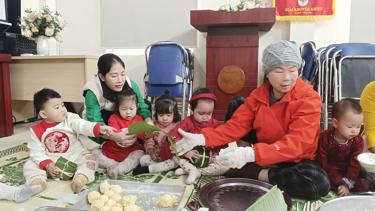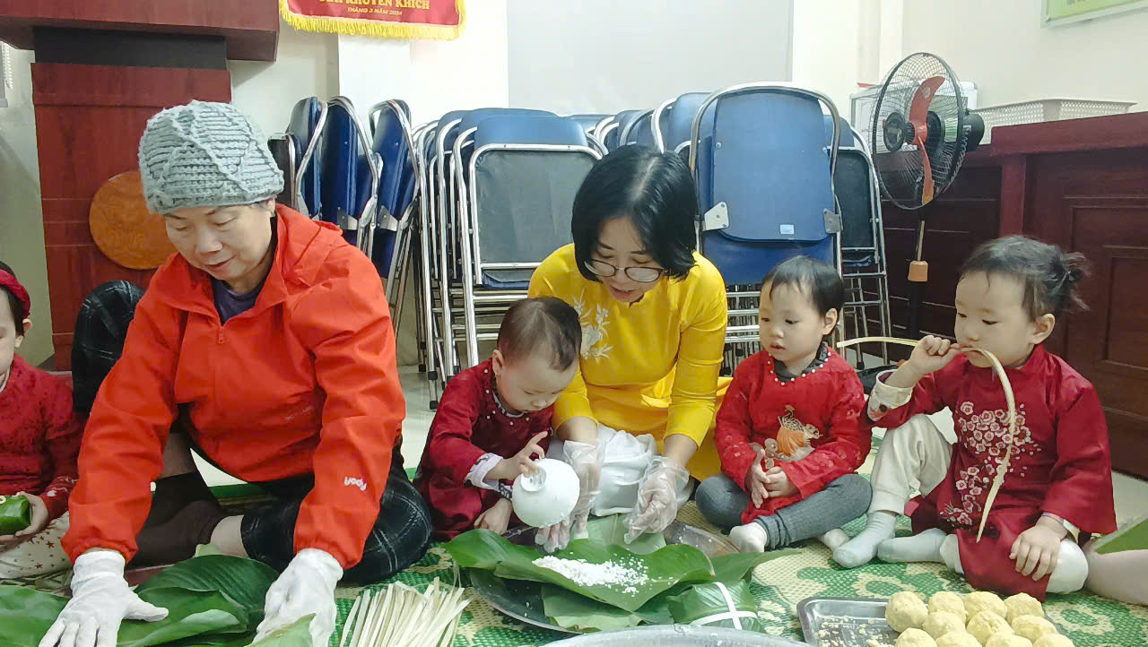 Hoạt động gói bánh chưng giúp các bé hiểu được về truyền thống của dân tộc ta tạo cho các con có một ngày Tết vui vẻ, đầm ấm và hạnh phúc bên người thân.