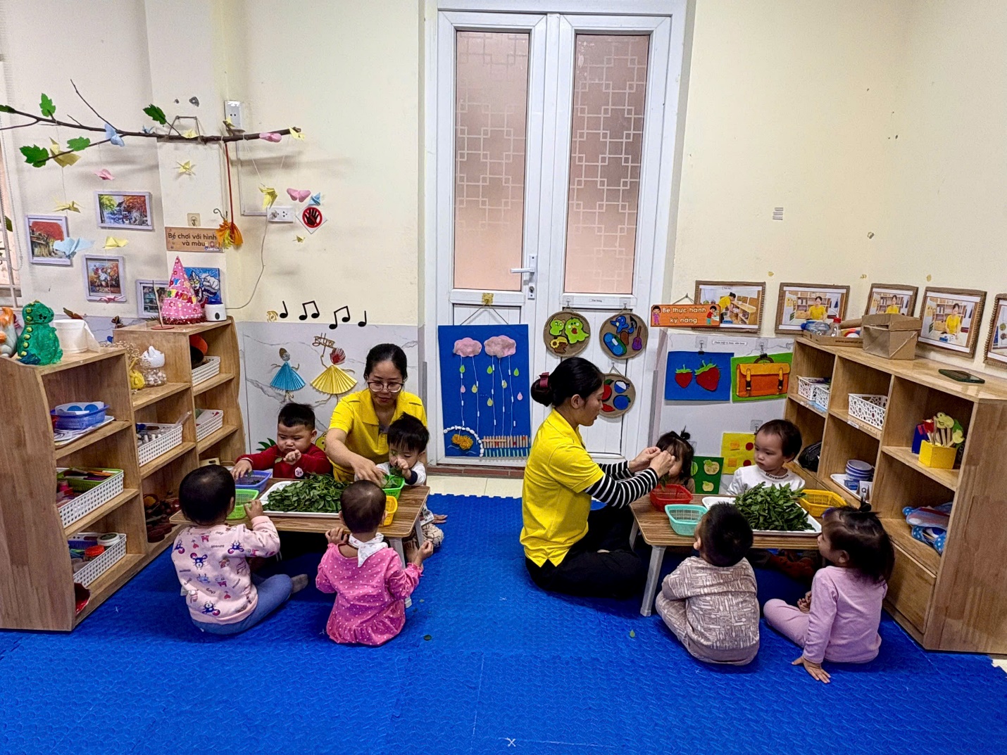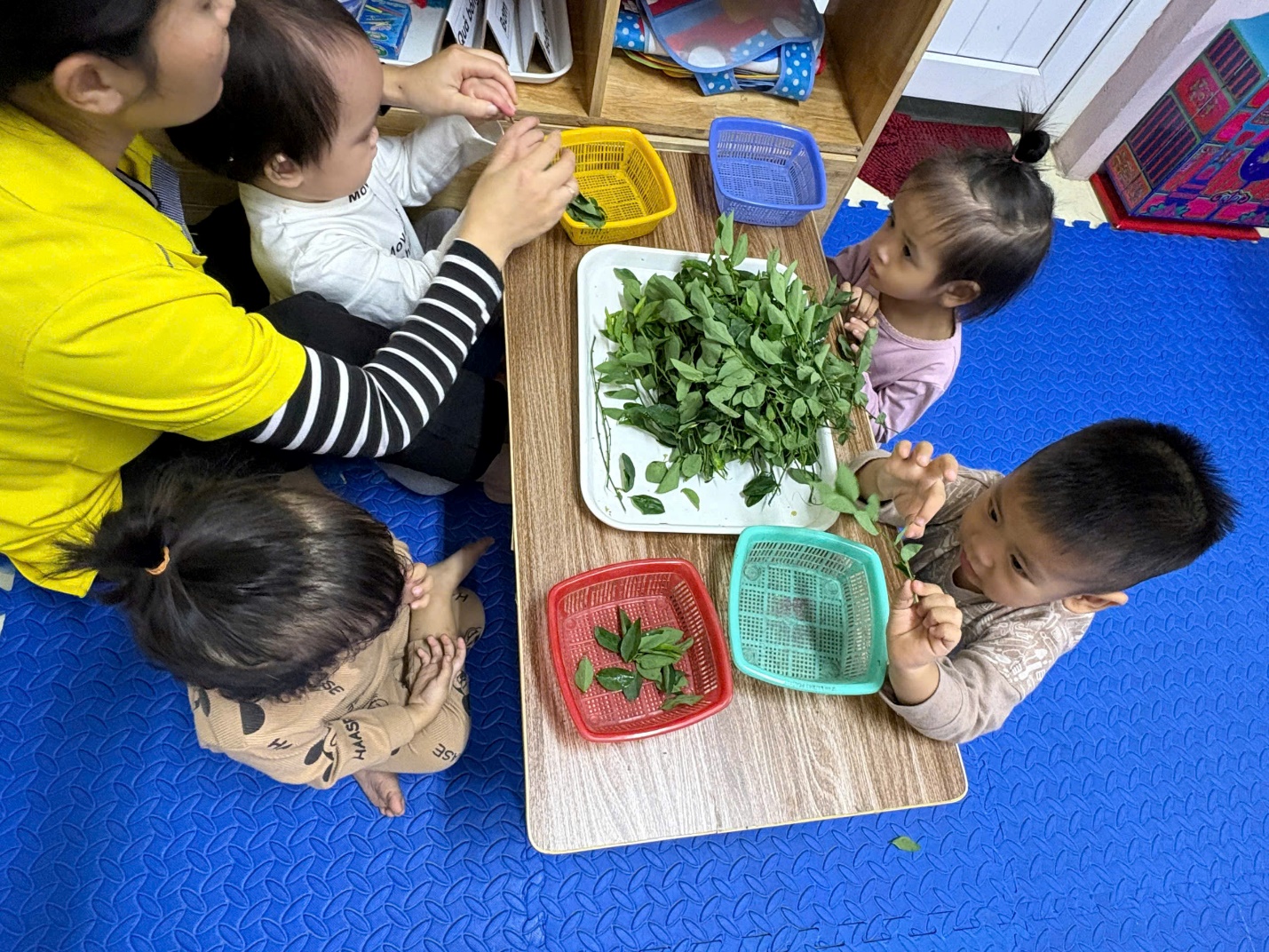 Nhằm giúp trẻ phát triển một số kỹ năng sống cơ bản biết cách sử dụng một số đồ dùng thông thường, tự phục vụ trong ăn uống…, các cô giáo lớp Nhà trẻ D đã tổ chức cho trẻ trải nghiệm Tuốt rau ngót.