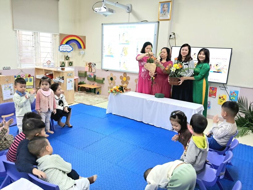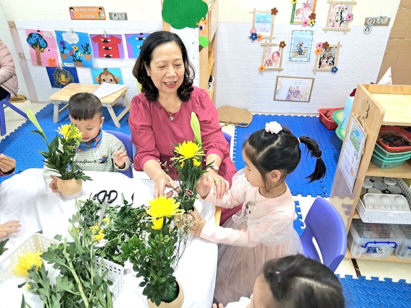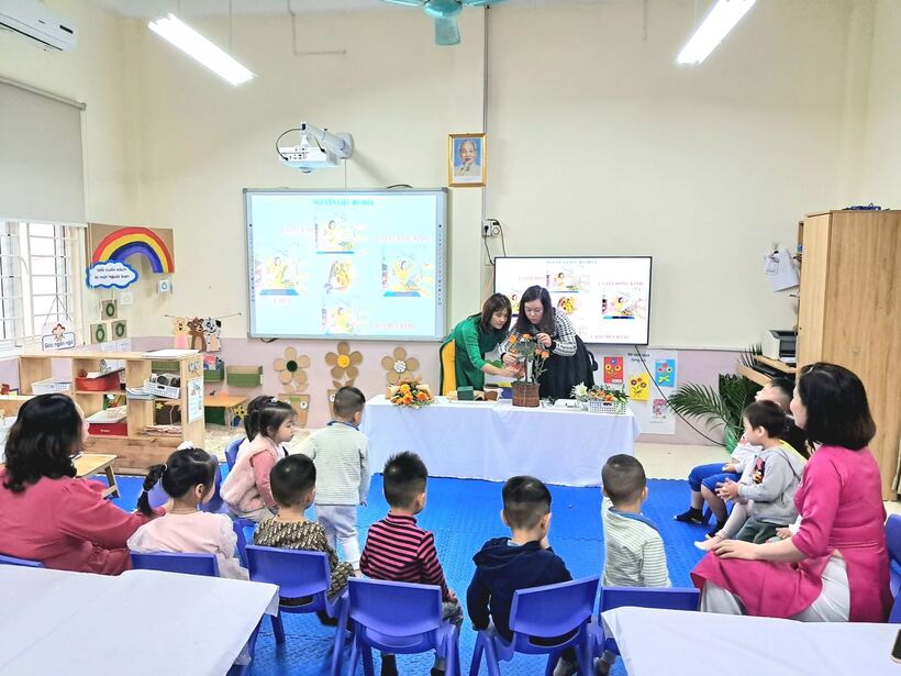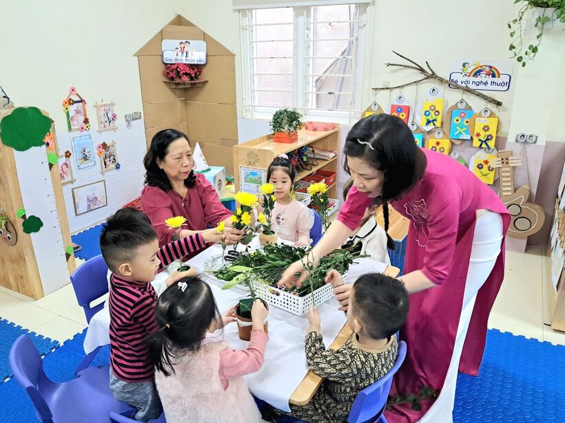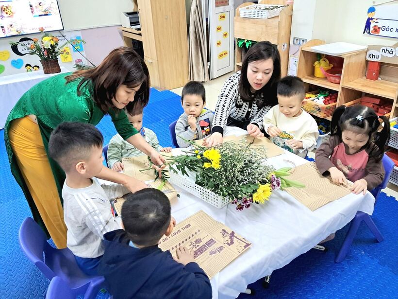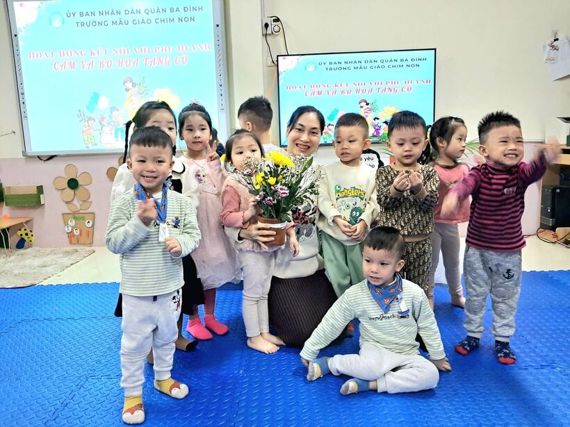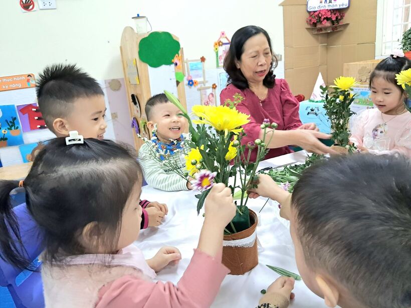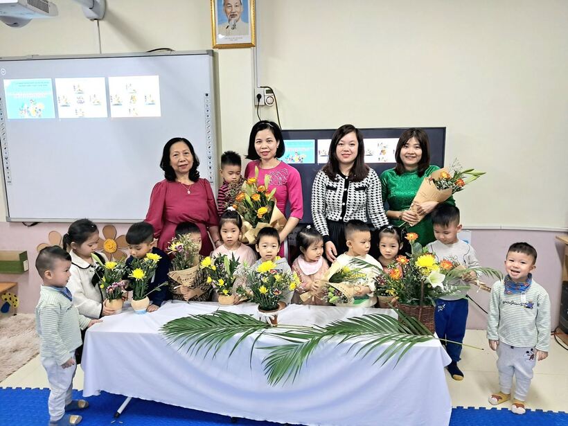Để chào mừng kỷ niệm 41 năm ngày Nhà giáo Việt Nam 20/11, sáng nay 16/11, lớp MG bé C2 đã tổ chức hoạt động kết nối với phụ huynh "Cắm hoa nghệ thuật tặng cô giáo". Đây là dịp đặc biệt để mẹ bạn Ngọc Bảo và bà bạn Minh Thư có thể trổ tài cắm hoa, bó hoa nghệ thuật và hướng dẫn các bạn nhỏ C2 tạo nên những chậu hoa, bình hoa, bó hoa xinh xắn tặng cô.