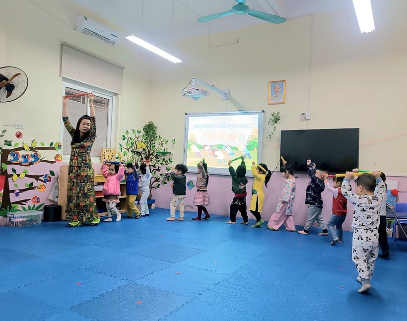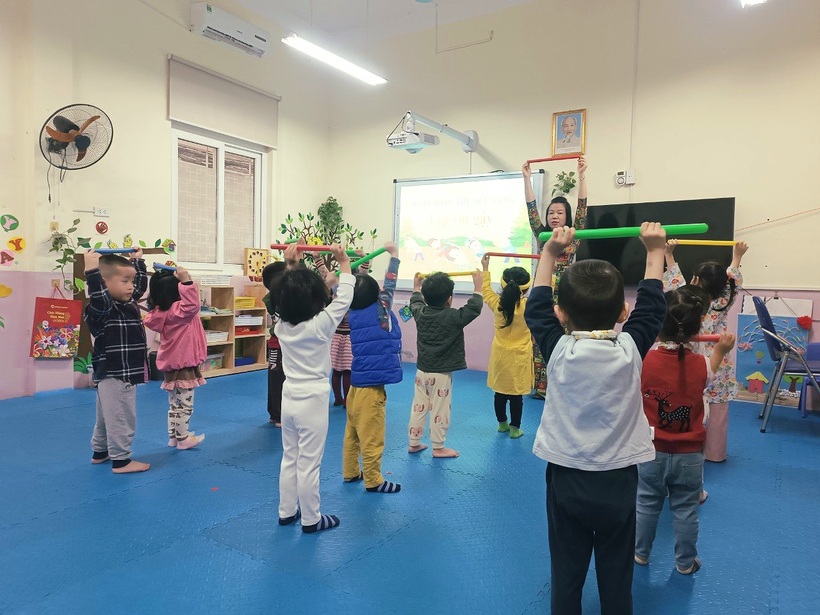 Cô và trẻ lớp Mẫu giáo bé C1 trường Mẫu giáo Chim Non -Ba Đình trong giờ thể dục