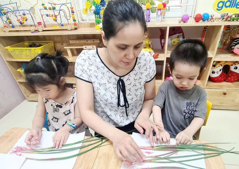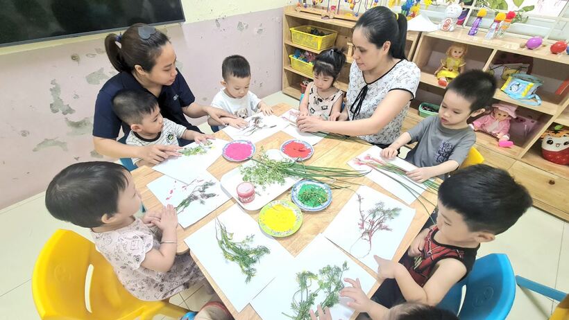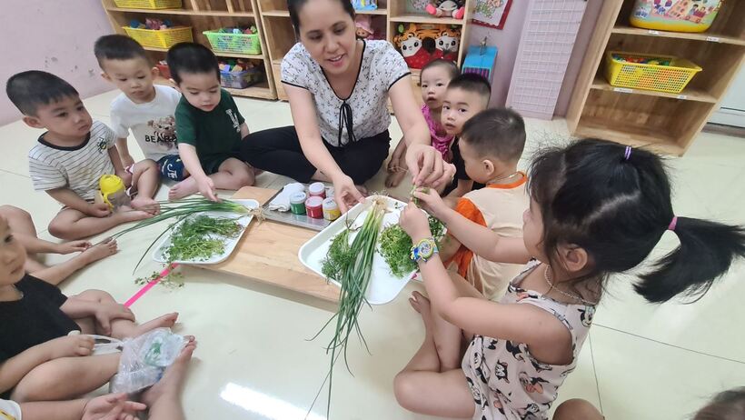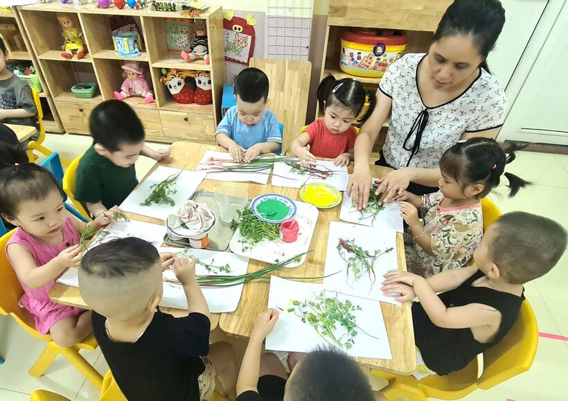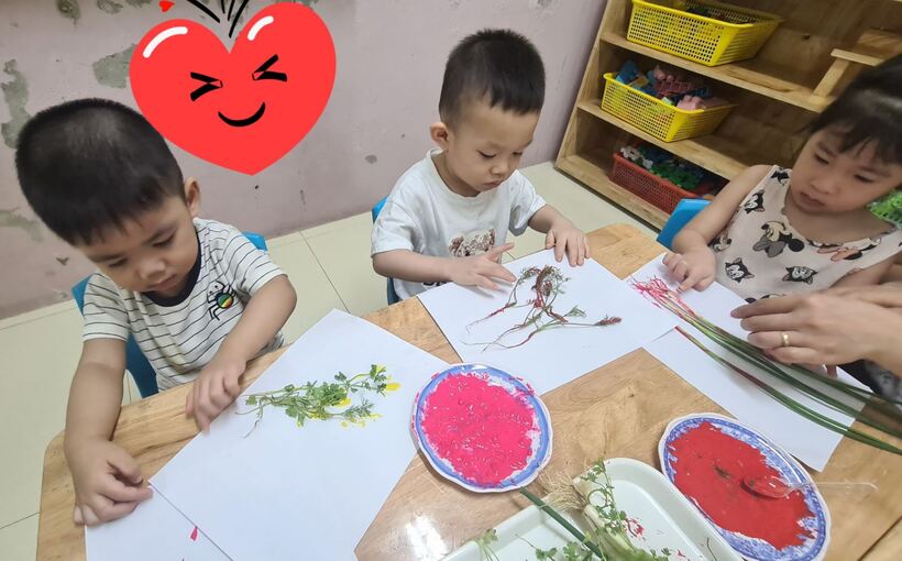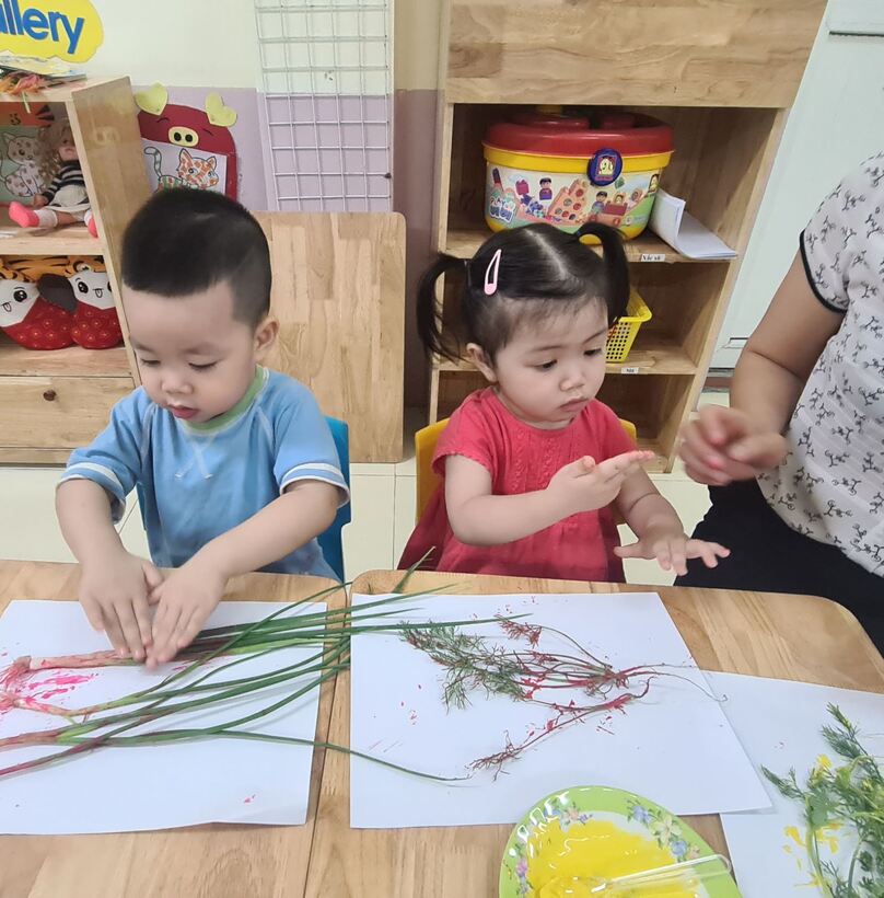 Hôm nay, cô giáo Nhung đã giúp các con nhìn, gọi tên, sờ, ngửi, vuốt, vặt, nhặt một số loại rau gia vị : hành , thì là, rau mùi. Các bé rất thích thú và đặc biệt hơn nữa là các con còn được tự tay in tranh từ các loại rau gia vị này nữa. Các nét in còn yếu, nguệch ngoạc nhưng là những tác phẩm đầu tay tuyệt vời giúp các con cảm nhận màu sắc, ích lợi của một số loại rau ngoài việc dùng nấu ăn còn để làm đẹp cho cuộc sống.