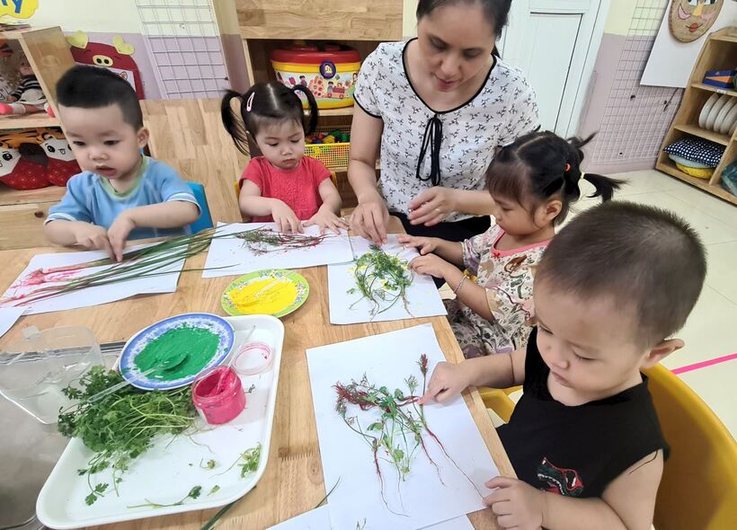 Nhân ngày gia đình Việt Nam 28/6, Các bé nhà trẻ hôm nay được vào bếp tìm hiểu một số loại rau gia vị mẹ dùng để nấu ăn. Sự thích thú của các bé tăng lên qua một loạt các hoạt động quan sát, gọi tên, cầm sờ ngửi, nhặt rau xếp để in tranh...dưới sự hướng dẫn gợi ý của các cô giáo