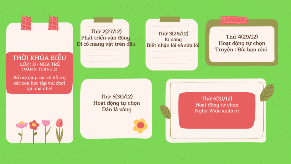 Trong thời gian các con nghỉ dịch, bố mẹ hãy cùng con tham gia các hoạt động với cô để giúp trẻ phát triển toàn diện trong giai đoạn này nhé. Nhà trường kính gửi quý phụ huynh Kế hoạch kết nối các hoạt động giáo dục khối Nhà trẻ tuần 5 tháng 12 năm 2021: