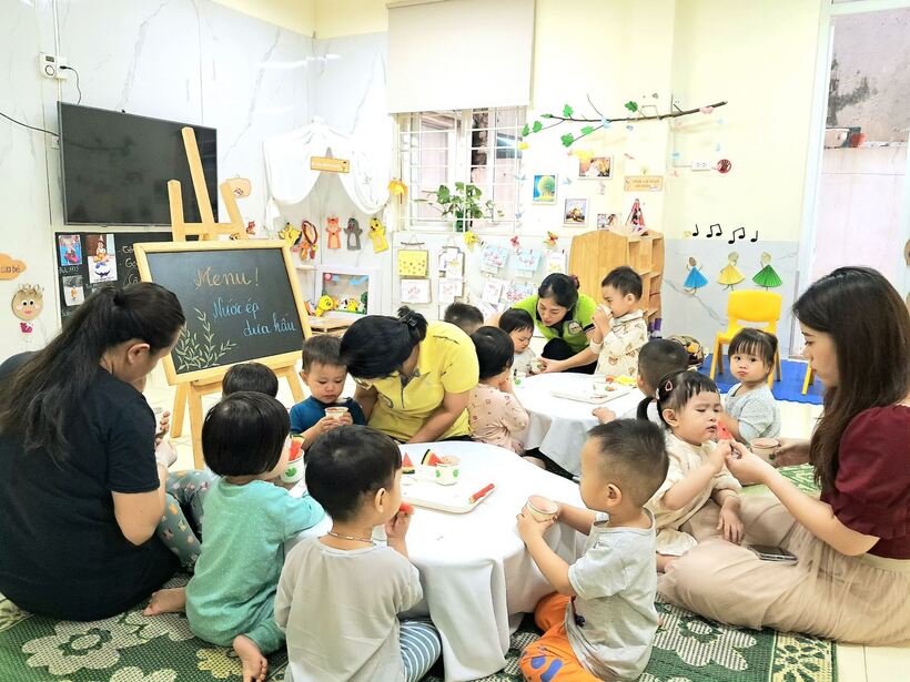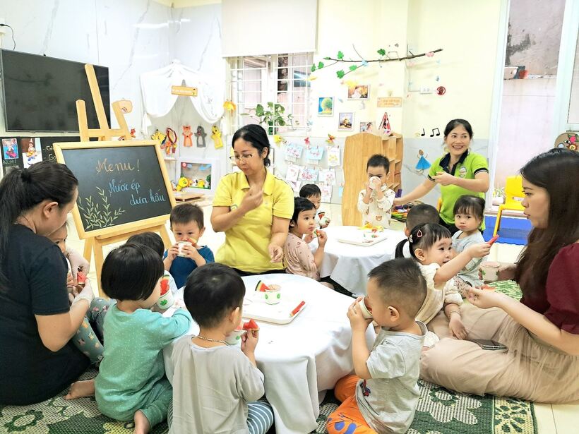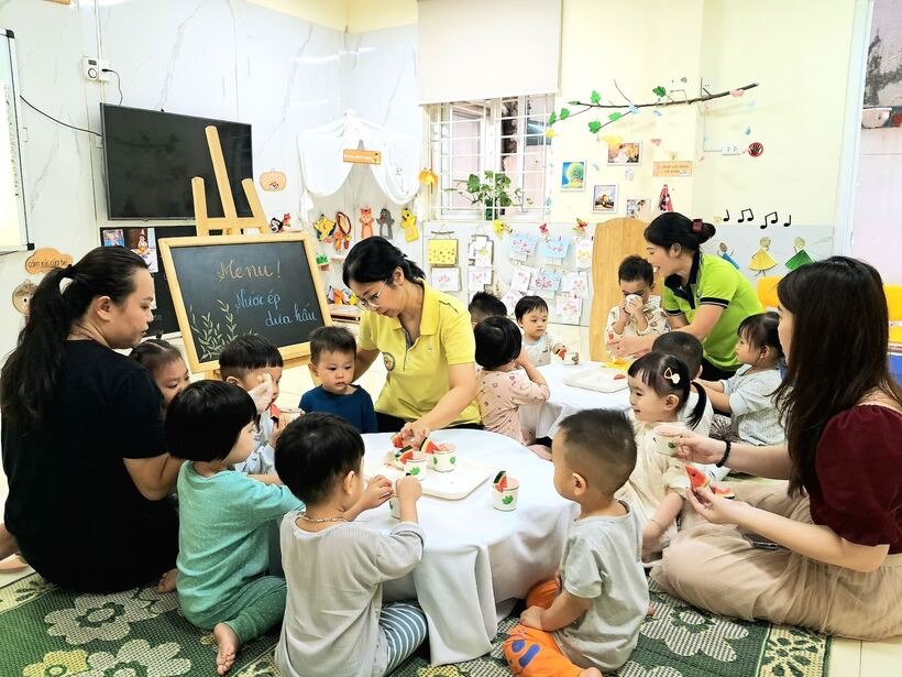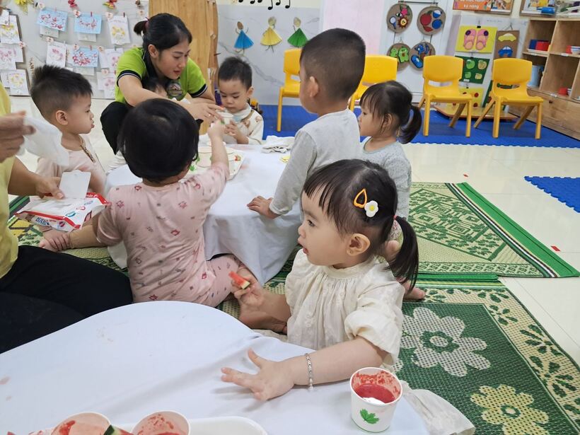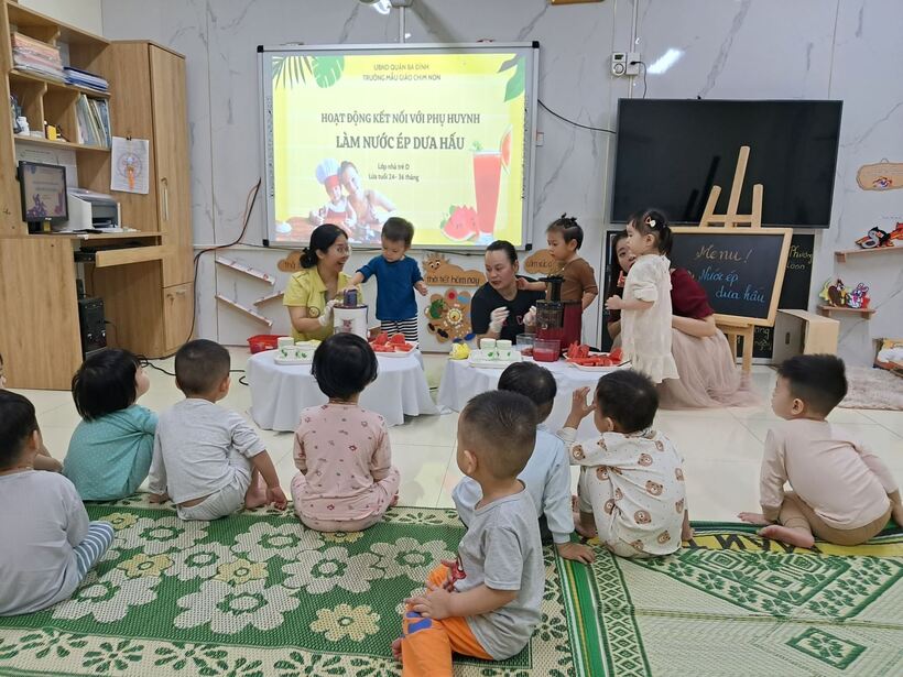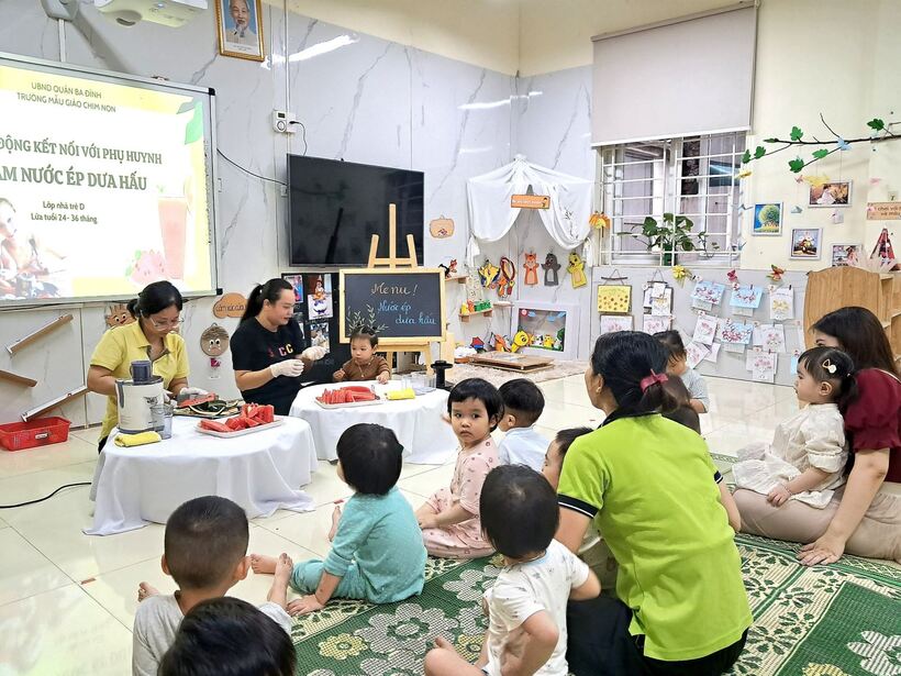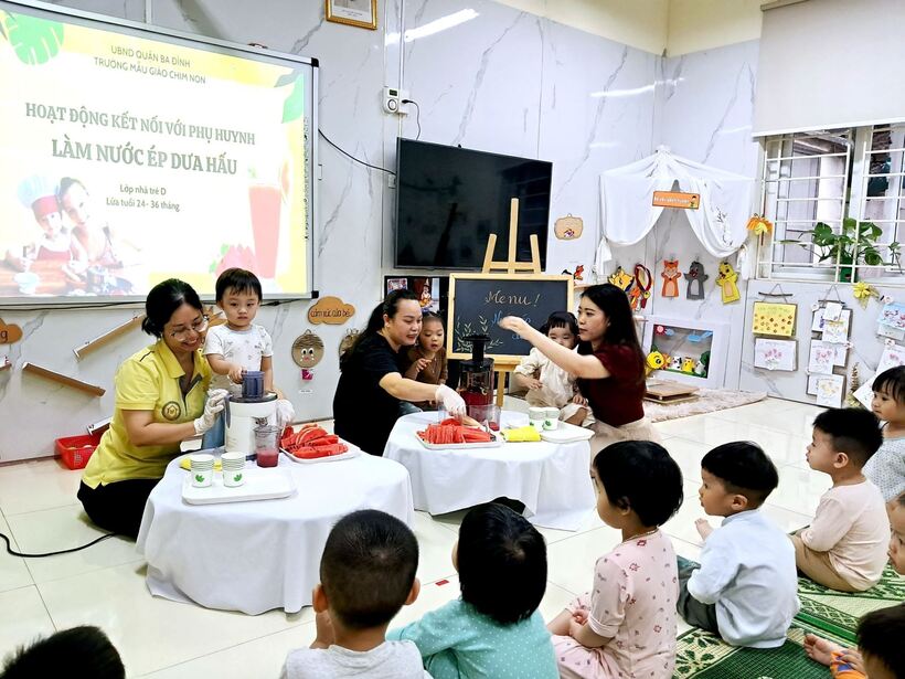 Với hoạt động "Làm nước ép dưa hấu", mẹ bạn Phương Anh và mẹ bạn Linh Đan lớp Nhà trẻ D đã hướng dẫn cho các bạn nhỏ cách làm ra một cốc nước ép tươi ngon bổ dưỡng với rất nhiều loại Vitamin tốt cho sức khỏe.