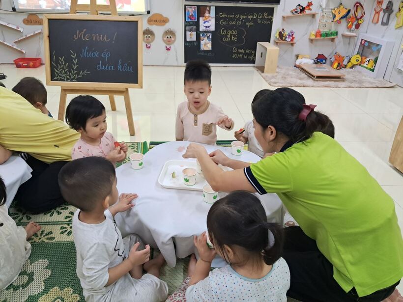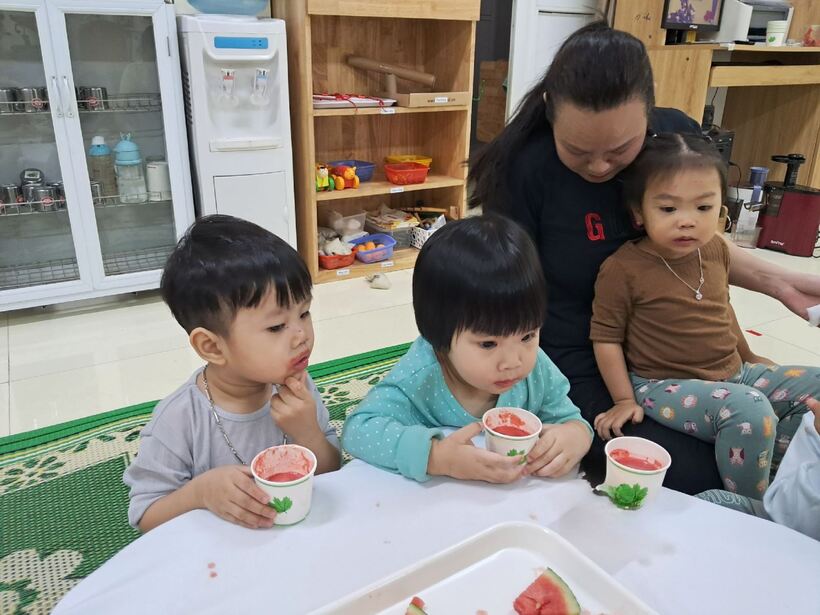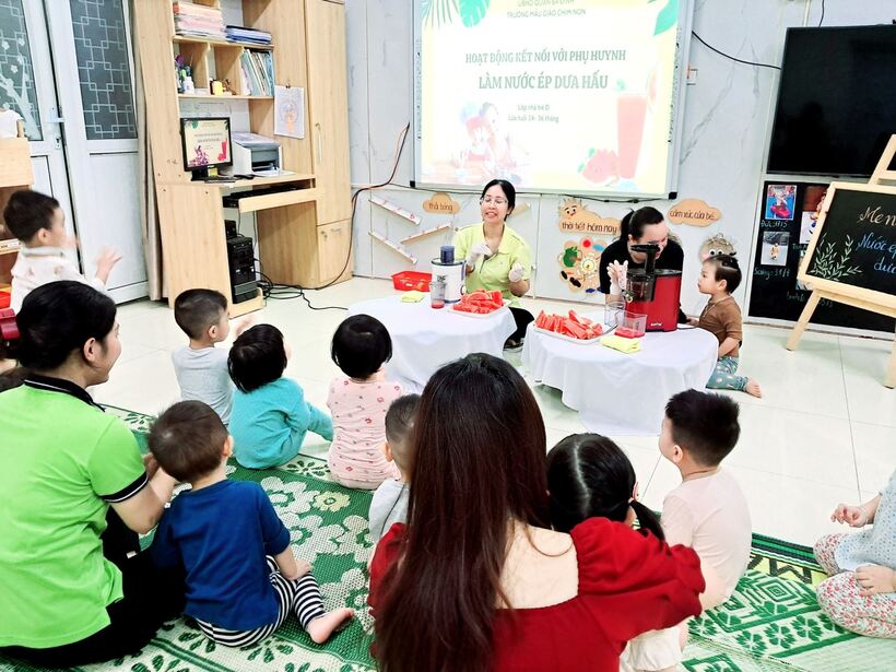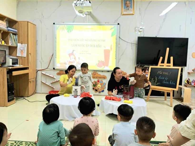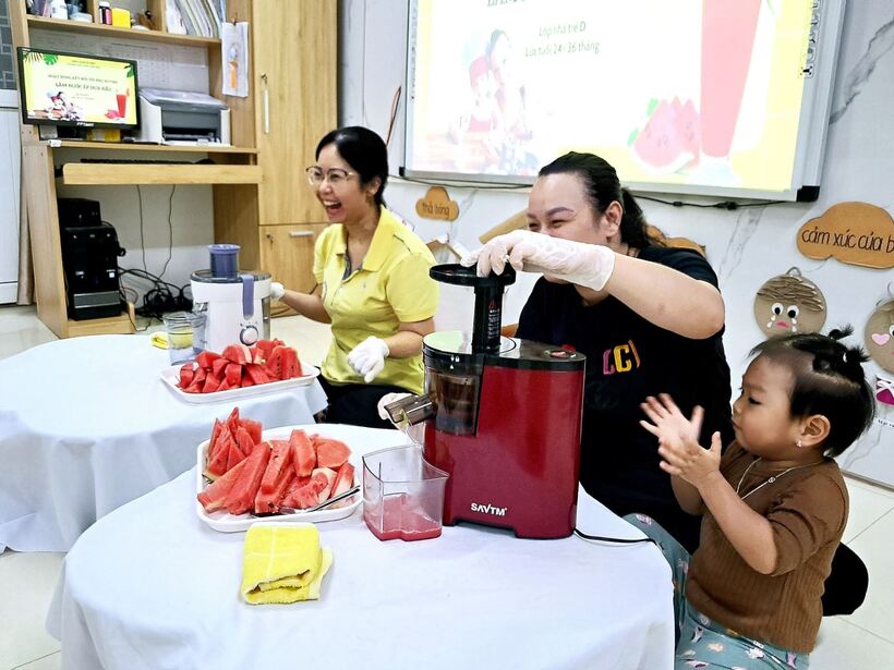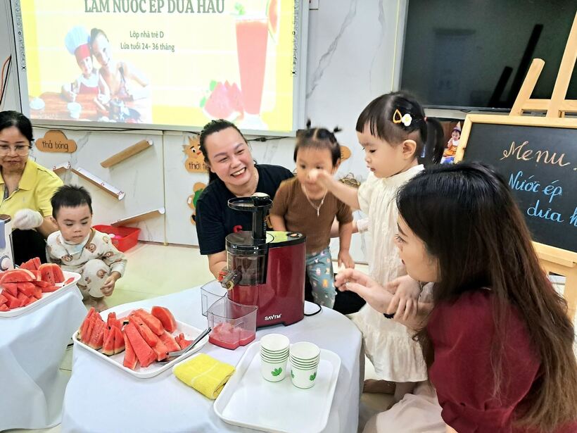 Các bạn nhỏ được quan sát, tìm hiểu về quả dưa dấu rồi được các cô các bác phụ huynh cho xem quy trình để làm ra một cốc nước ép như thế nào. Các bạn nhỏ rất vui và hào hứng khi nhìn máy ép quay và nước dưa hấu được chảy ra các cốc. Thú vị hơn nữa, các cô, bác cho các bạn nhỏ được trực tiếp trải nghiệm bỏ miếng dưa hấu đã cắt nhỏ vào máy ép. Và cuối cùng, các bạn nhỏ rất vui và sảng khoái khi được thưởng thức cốc nước ép dưa hấu tuyệt vời do chính tay mình làm ra.