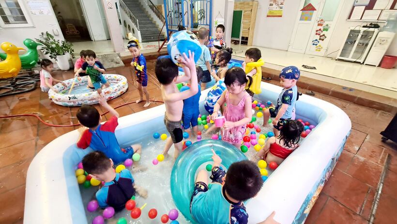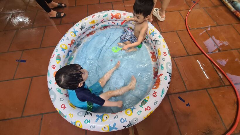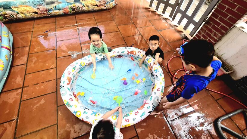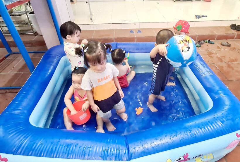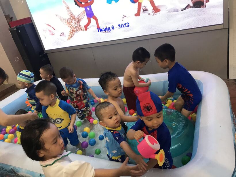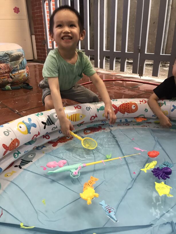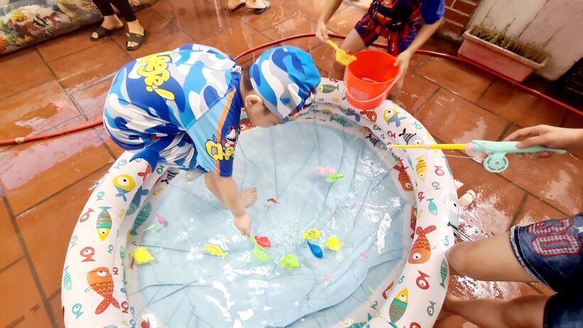 Các bé đã rất hào hứng trải nghiệm với những trò chơi nước thú vị : bắn súng, đập bóng, câu cá, mò tìm "kho báu" với thật nhiều đồ chơi nước, bóng sắc màu.