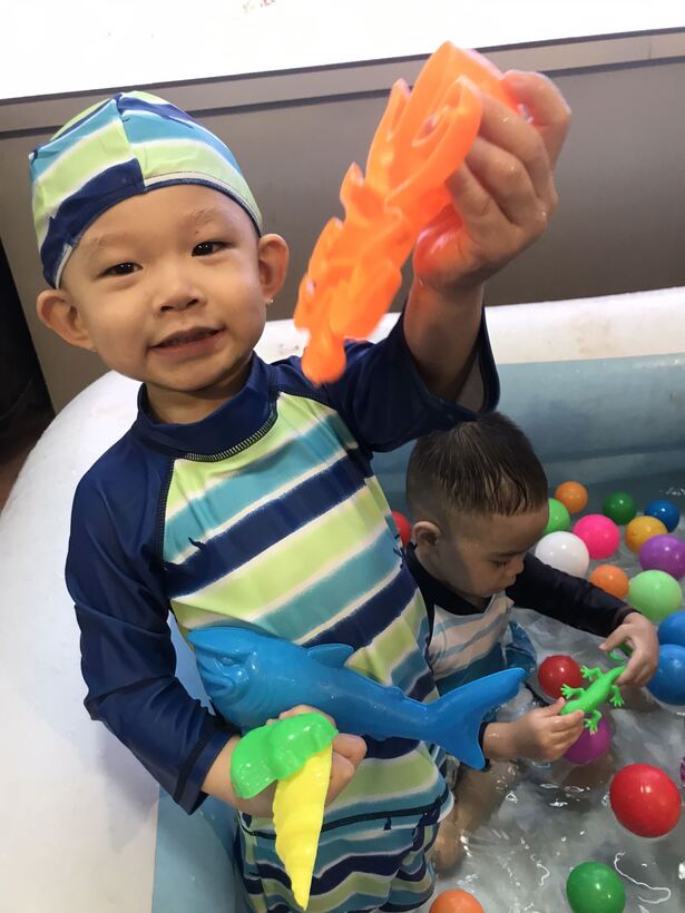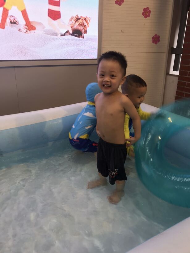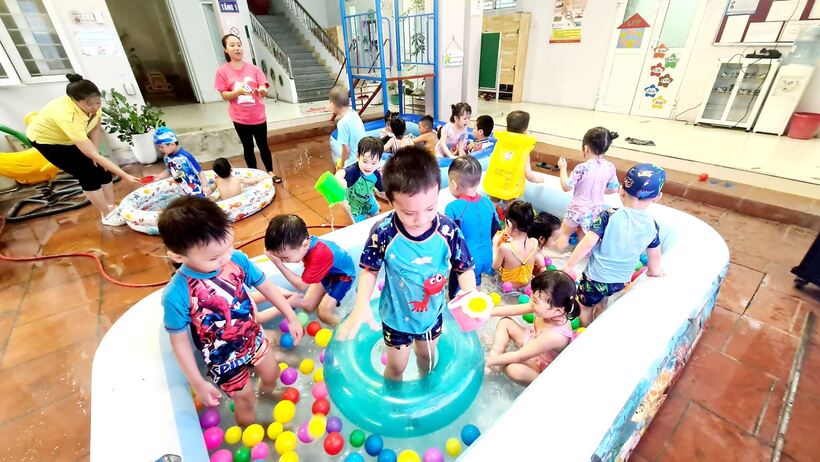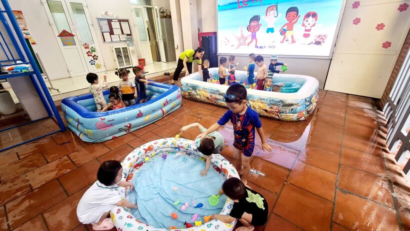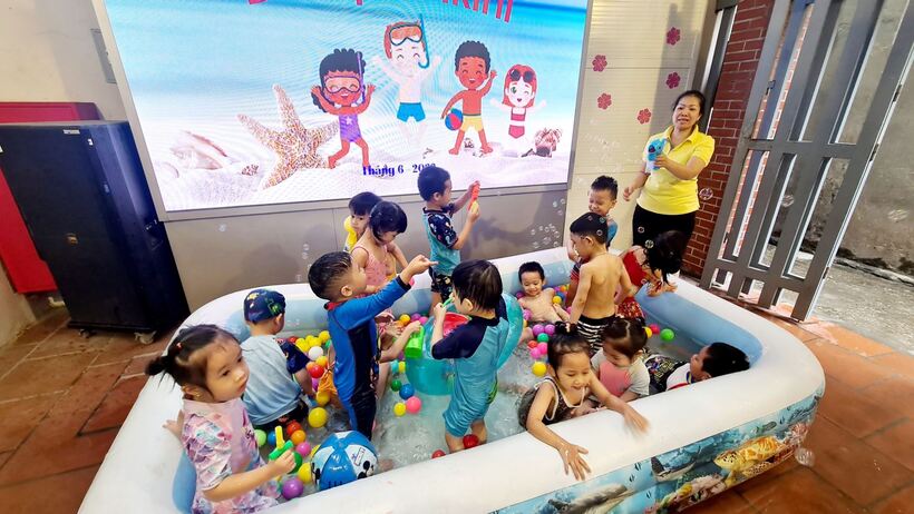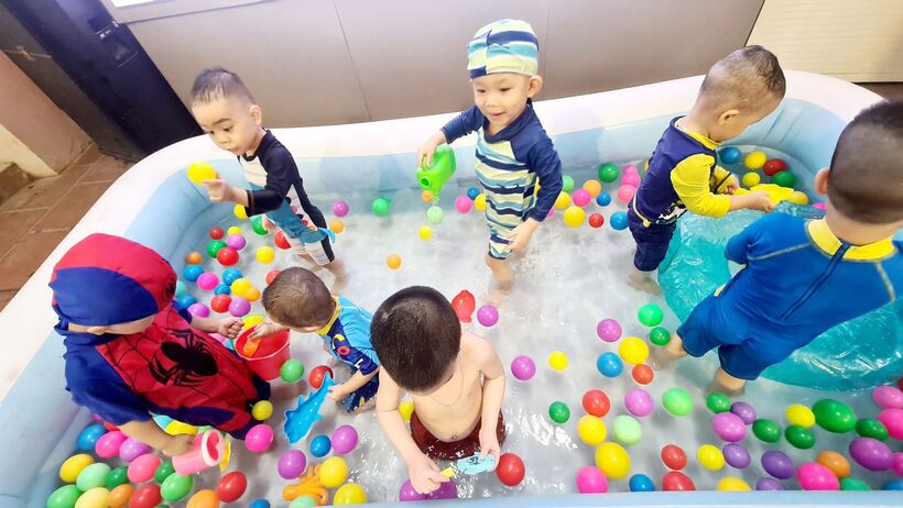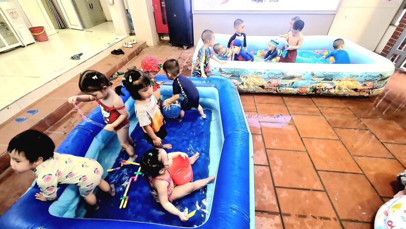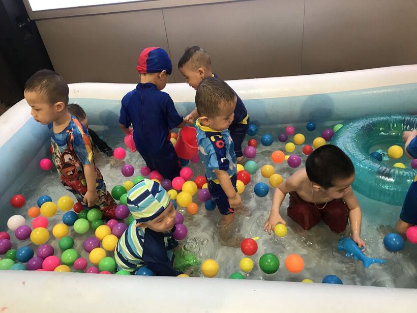 Các bé đã rất hào hứng trải nghiệm với những trò chơi nước thú vị : bắn súng, đập bóng, câu cá, mò tìm "kho báu" với thật nhiều đồ chơi nước, bóng sắc màu.