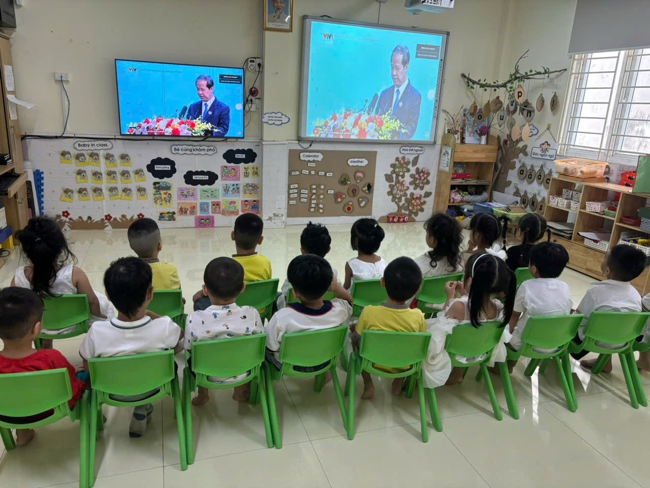 Từ 8h00, toàn thể đại biểu, cán bộ, giáo viên, nhân viên, phụ huynh và các con học sinh trong trường tham dự chương trình chung của Lễ kỷ niệm 80 năm thành lập Bộ Quốc gia Giáo dục (nay là Bộ Giáo dục và Đào tạo).