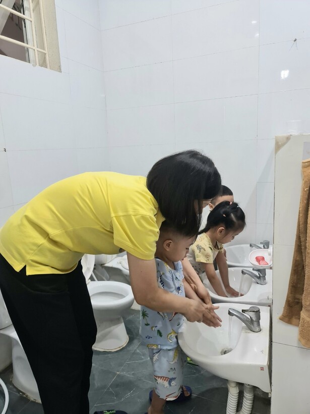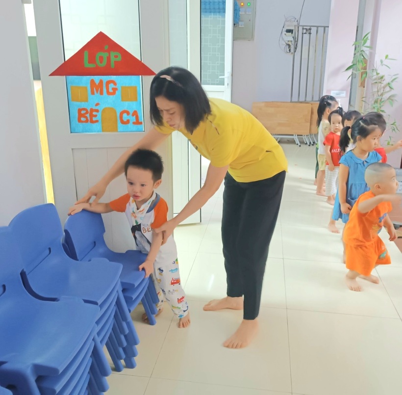 Bạn nào cũng không giấu được vẻ ngây thơ hồn nhiên đôi lúc rụt rè khi bước chân vào lớp mẫu giáo nhỡ C1. Các cô hiểu tâm lý các con, ân cần niềm nở trò chuyện và dỗ dành các con vào lớp để hòa nhập với các bạn. Cô dạy các con từng kỹ năng bê cất ghế, lấy cất dép, uống nước, xếp hàng, rửa tay, lau mặt, đi vệ sinh đúng chỗ...Kỹ năng nào cũng cần hướng dẫn tỉ mỉ, cụ thể và nhắc lại nhiều lần :