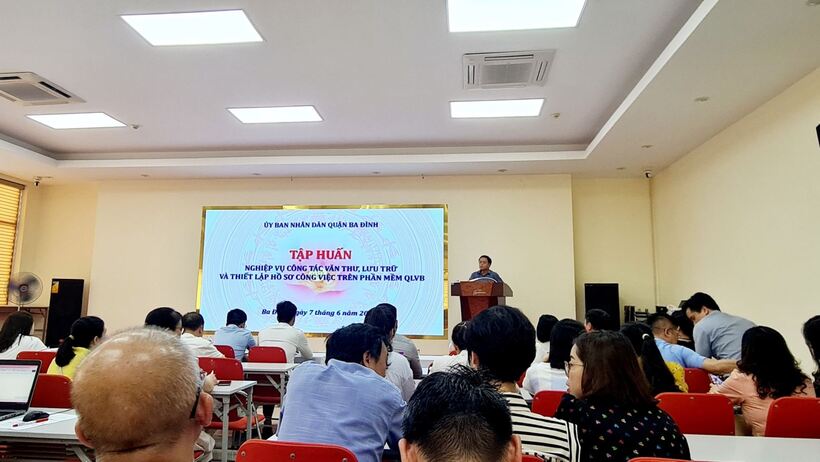 Chiều ngày 07/6, trung tâm chính trị phối hợp với phòng nội vụ Quận Ba Đình tổ chức thành công buổi tập huấn Nghiệp vụ công tác văn thư, lưu trữ và thiết lập hồ sơ công việc trên phần mềm Quản lý văn bản cho cán bộ công chức và viên chức làm công tác văn thư, cán bộ quản lý trong địa bàn Quận