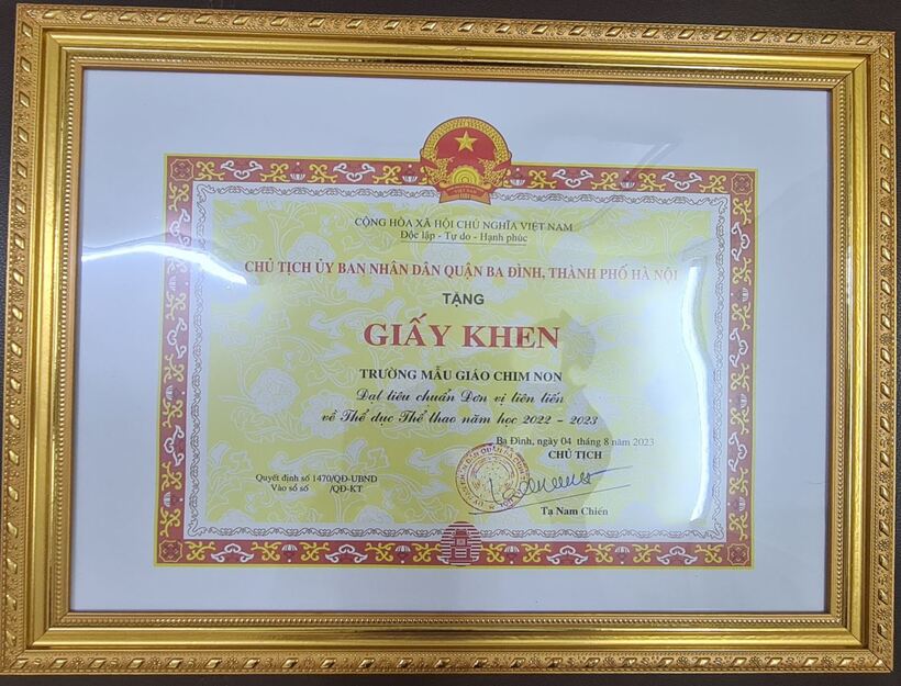 Sáng ngày 22/09/2023, tại sân vận động Quần Ngựa, Trường Mẫu giáo Chim Non được nhận giấy khen đạt tiêu chuẩn đơn vị tiên tiến về Thể dục thể thao năm học 2022 - 2023 của chủ tịch UBND quận Ba Đình