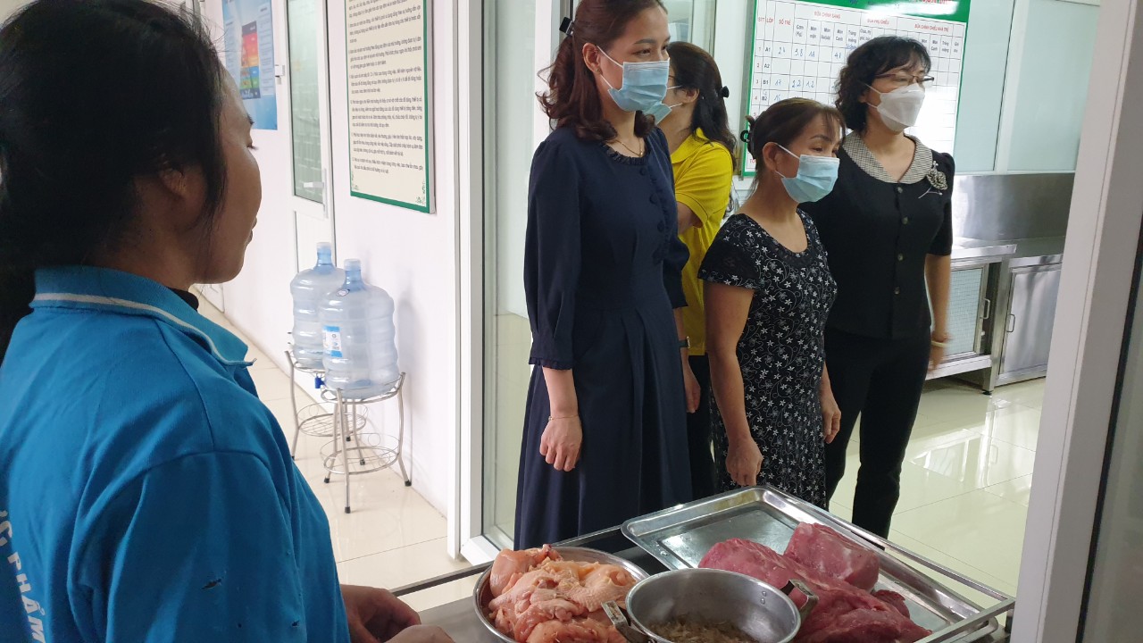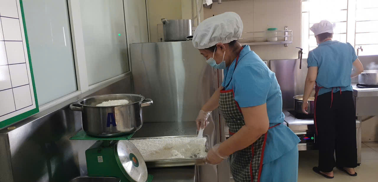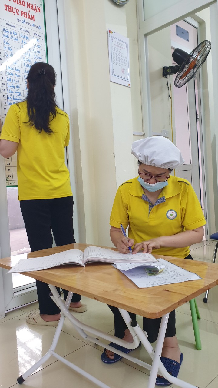 Nhà trường giao nhận thực phẩm vào đầu giờ sáng với đầy đủ thành phần: Đại diện CMHS, Ban giám hiệu, kế toán nhà ăn, y tế, cô nấu chính, giáo viên lớp theo danh sách phân công.