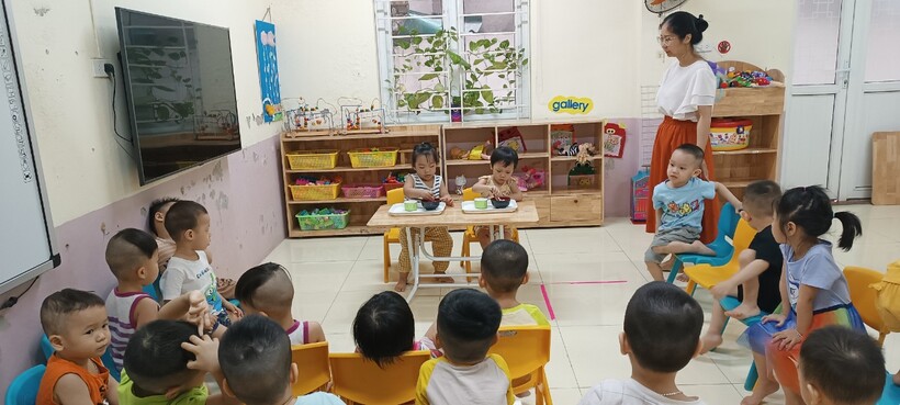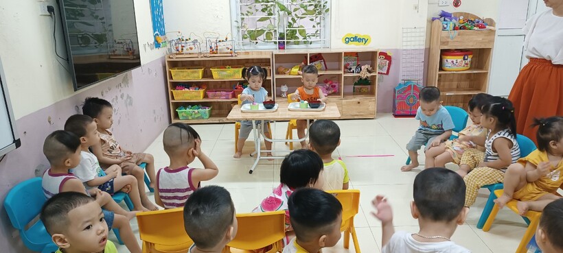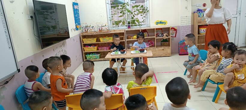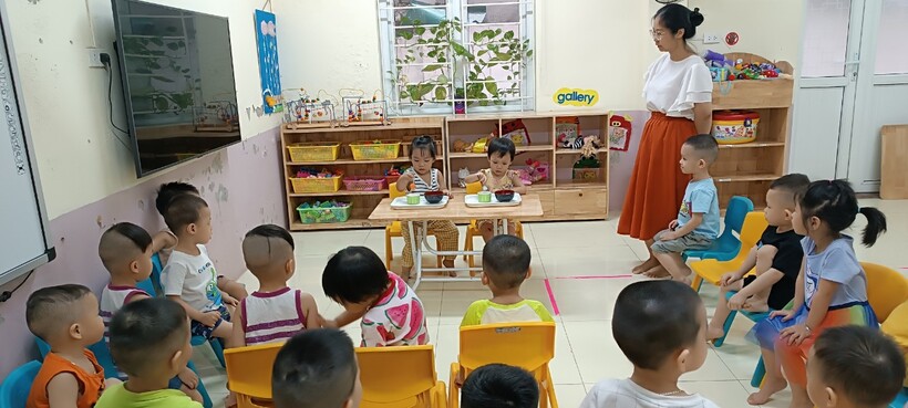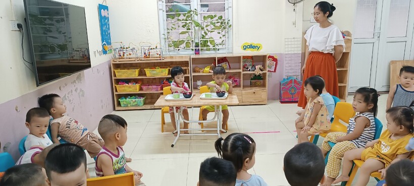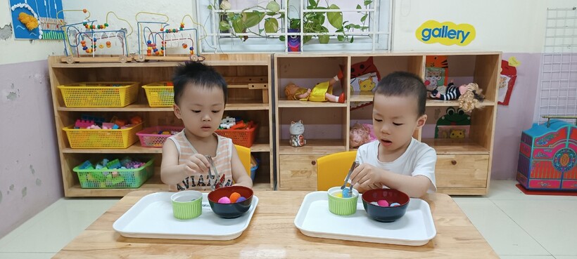 Các bạn nhỏ lớp nhà trẻ trường mẫu giáo Chim Non lần đầu thực hiện thao tác gắp chuyển vật dưới sự hướng dẫn của cô. Thật khó khi gắp quả bông nhỏ, nhẹ với cái kẹp gắp hình bàn tay lạ mắt. Tuy nhiên, bằng sự kiên trì luyện tập cho đôi bàn tay thêm khéo léo, các bé đã hoàn thành xuất sắc hoạt động kỹ năng của mình