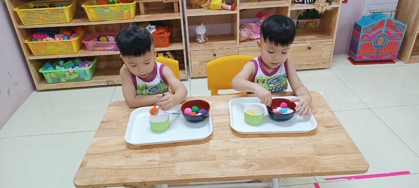 Mời bố mẹ xem một số hình ảnh các con tập gắp chuyển quả bông tại lớp: