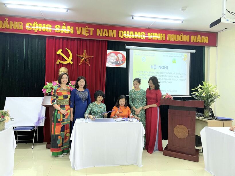 Tại hội nghị, Hiệu trưởng của hai nhà trường báo cáo về đặc điểm, tình hình hoạt động nổi bật của nhà trường và  hợp tác triển khai kế hoạch hoạt động giao lưu, kết nối, chia sẻ, cùng ký kết Biên bản ghi nhớ Kết nghĩa, thực hiện kế hoạch thực hiện chương trình “Nhà trường cùng chung tay phát triển, thầy cô cùng sẻ chia trách nhiệm” giai đoạn 2023-2025 và triển khai đến 100% cán bộ, giáo viên, nhân viên 02 trường.