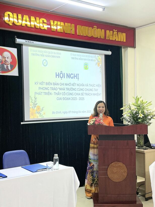 Chiều ngày 07/04/2023, Mẫu giáo Chim Non Ba Đình và trường Mầm non Vân Hòa B - Ba Vì đã thông qua  Bản ghi nhớ Kết nghĩa và thực hiện chương trình “Nhà trường cùng chung tay phát triển - Thầy cô cùng sẻ chia trách nhiệm giai đoạn 2023- 2025”