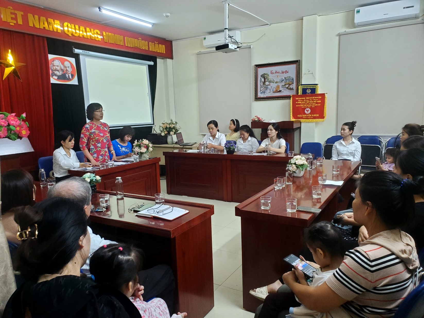 Đồng chí Nguyễn Thị Thanh Huyền – Phó Bí thư Chi bộ, Phó Hiệu trưởng nhà trường báo cáo khái quát kết quả thực hiện phối kết hợp giữa nhà trường với PHHS về công tác phối hợp với phụ huynh giáo dục kỹ năng thực hành cuộc sống cho trẻ.
