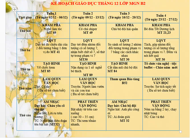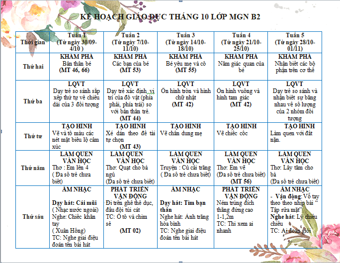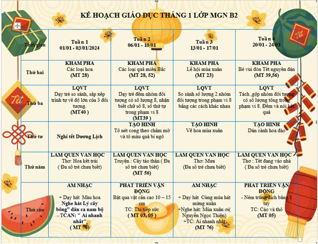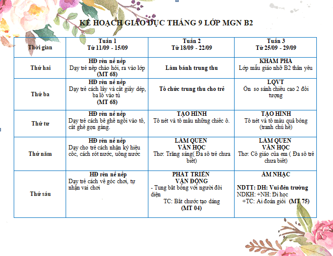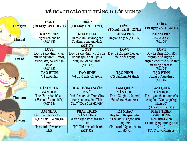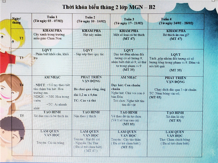 Bố mẹ theo dõi những hoạt động hấp dẫn của con ở trường trong Kế hoạch hoạt động của lớp B2 dưới đây nhé