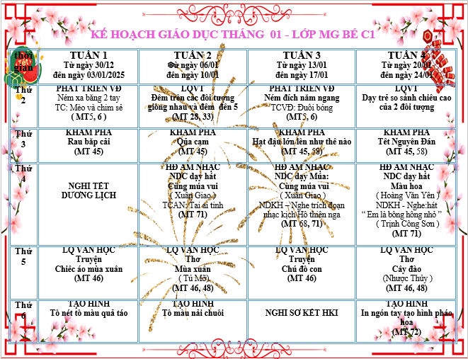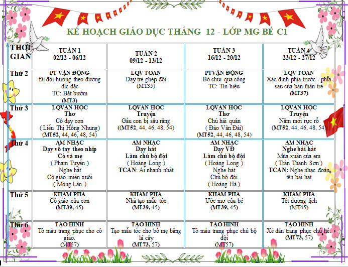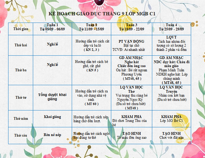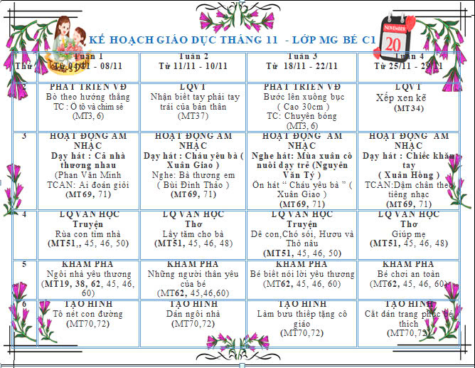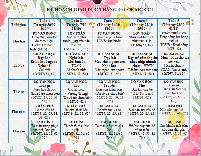 Bé lớp C1 mỗi ngày đến lớp sẽ được tham gia rất nhiều hoạt động, dưới đây là KH giáo dục lớp, kính mời quý vị PH cùng theo dõi